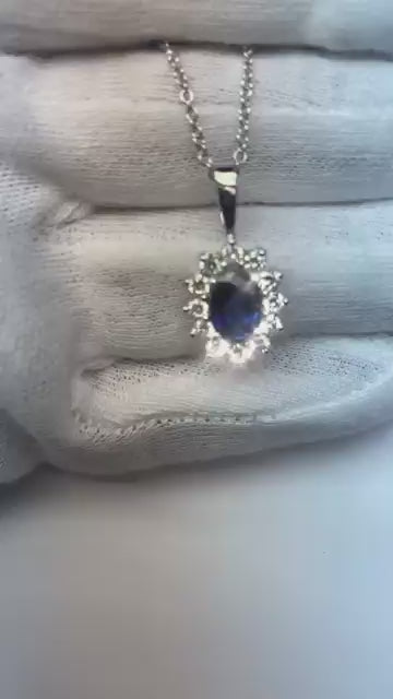 Anhänger Halskette Ceylon Saphir mit Diamanten 3.20 ct Weißgold 14K