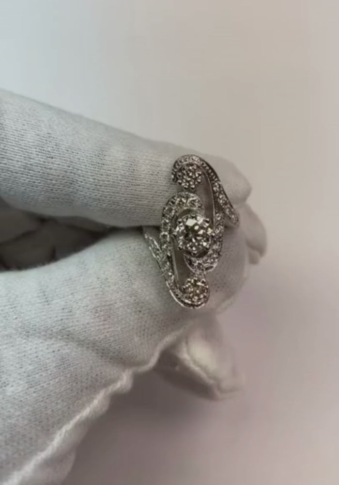 Steindetails: Es gibt einen rund geschliffenen alten Bergmannsdiamanten von ca. . 1 Karat (ca. Ø 6,1 mm) und ca. 1,75 Karat kleinere Diamanten an den Seiten. Diamanten aus natürlicher Erde.