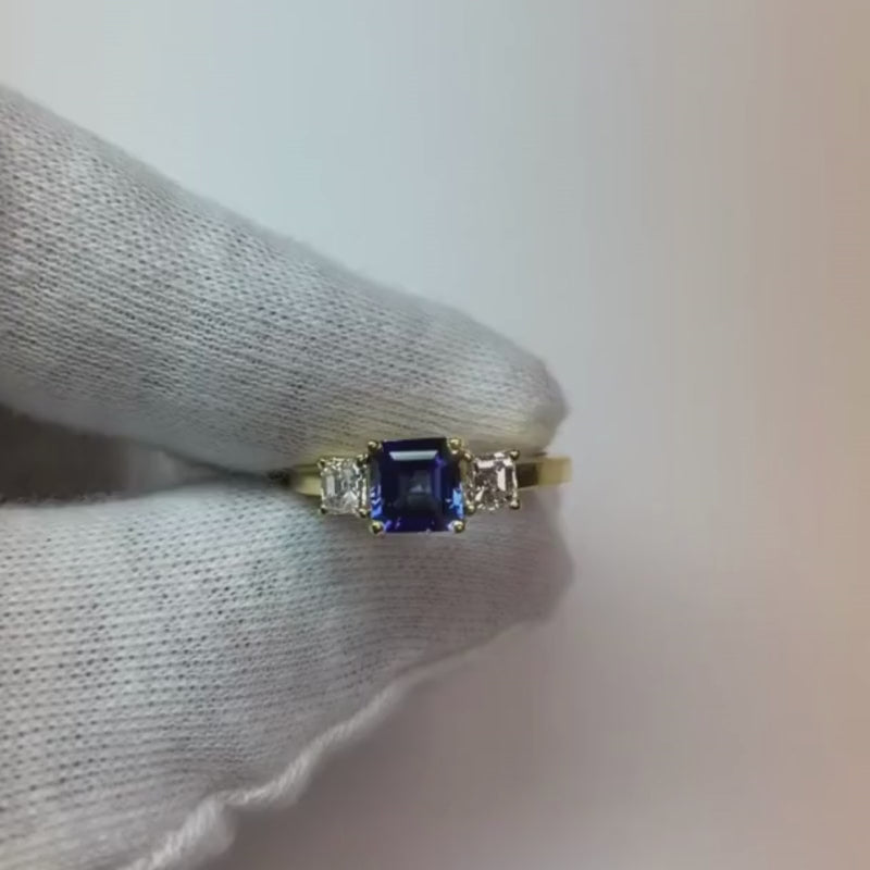 Steindetails: Es gibt einen Saphir im Asscherschliff ca. 1,50 Karat (ca. Größe 6 x 6 mm) und zwei Asscher Diamanten ca. je 0,25 Karat (ca. Größe 3,9 x 2,8 mm) an den Seiten. Natürliche, aus der Erde gewonnene Steine.