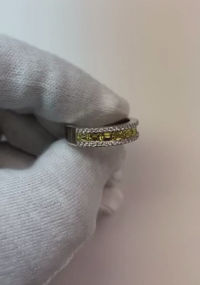 Steindetails: Dieser Ring hat eine Reihe von 9 kanarischen Diamanten im gelben Smaragdschliff von ca. 0,25 Karat (Größe ca. 3,5 x 2,5 mm) und ca. 1 Karat runde Diamanten an den Seiten. Natürliche Diamanten aus Erdminen.