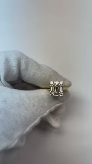 Steinspezifikationen: Es gibt einen Smaragd Diamant in der Mitte von ca. 1,51 Karat und ca. 1,61 Karat kleinere Baguettes und runde Diamanten am Schaft. Diamanten aus natürlicher Erde.