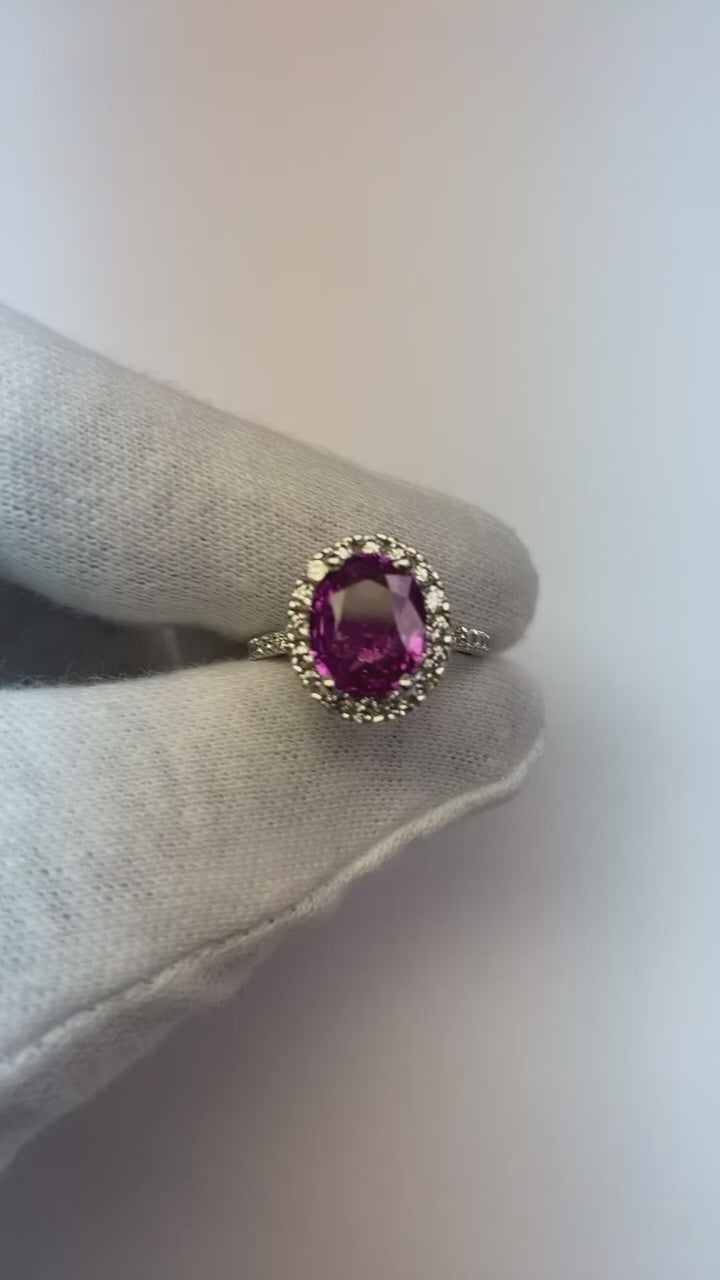 Steindetails: Dieser wunderschöne Halo-Ring hat einen oval geschliffenen rosafarbenen Saphir in der Mitte, ca. 3,75 Karat (ca. Größe 11,4 x 7,4 mm) mit ca. 1 Karat runde Diamanten an den Seiten. Entworfen mit natürlichen Erdsteinen.